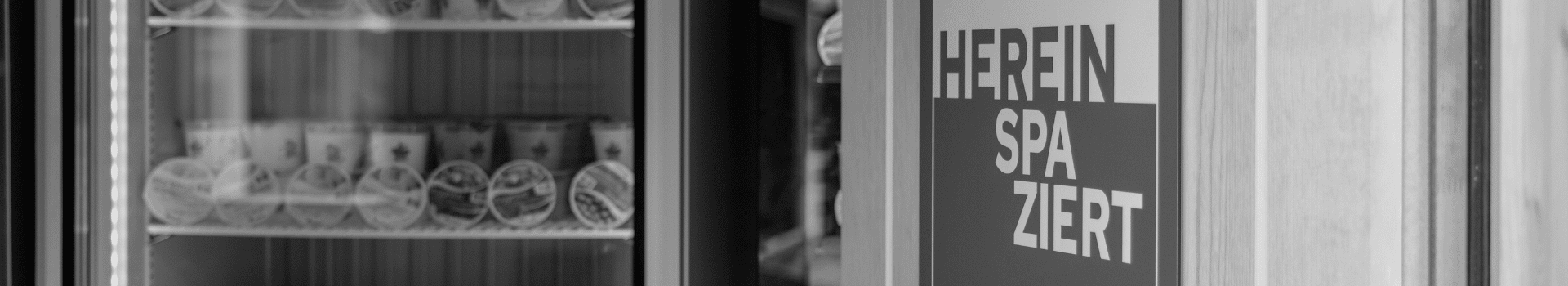 Drinnen erwartet Sie eine feine Auswahl unserer Produkte: Glacé für spontane Schleckmäuler, Käse in allen Variationen, cremiger Joghurt, frischer Quark und natürlich unsere feine Milch. Ob Sie am Sonntagmorgen den Brunch retten, ein spontanes Mitbringsel suchen oder einfach Lust auf etwas Süsses haben – hier finden Sie bestimmt das Richtige.